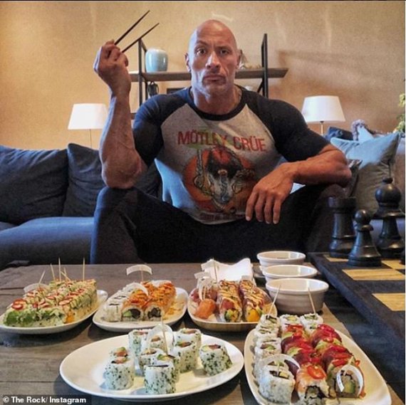 Роллы с 90 кусочков знаменитость сел есть за просмотром биографической ленты на Netflix. Подписчики Джонсона были поражены таким количеством пищи. Некоторые не не поверили, что это все для одного человека.