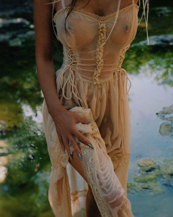 Актриса предстала перед камерой в мокром прозрачном платье без белья. Образ дополнила нежным макияжем и перьями в волосах.