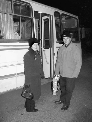 Ждем несколько минут. Из автобуса, который остановился неподалеку, выходит женщина. Зовет Юрия. Бондари идут туда.