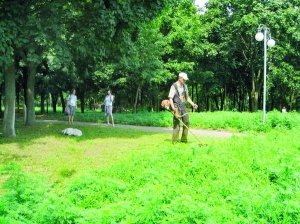 В парке возле роддома участки сплошной амброзии. Работник коммунального предприятия "Дирекция парков" 47-летний Леонид Иванович косит с восьми утра. Выключает и кладет на землю мотокосу.