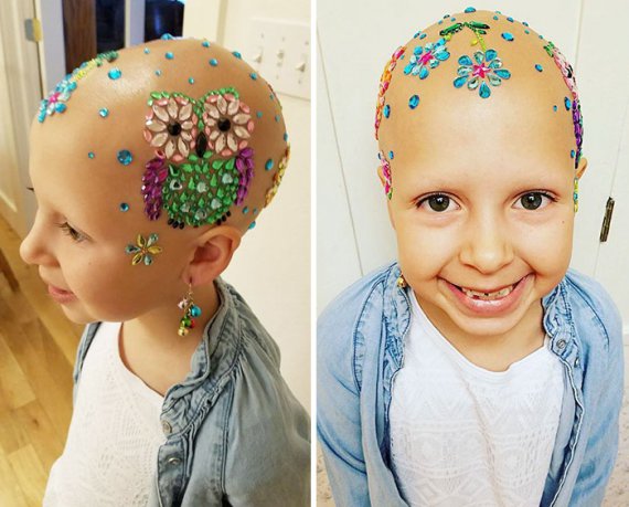 Женщина решила, что ее дочь не должна пропустить фестиваль причесок в школе и придумала "прическу" для Джианессы. Голову девочки украсили разноцветными блестками, приклеенными в виде узоров.