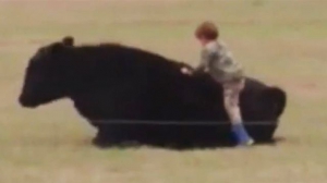 Маленький мальчик на спор запрыгнул на спину быка после того, как отец пообещал ему за это $20.
