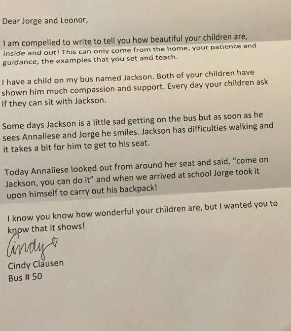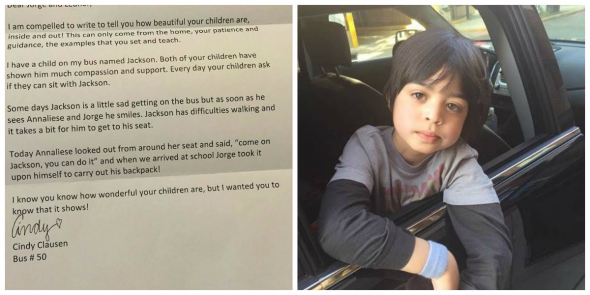 У меня в автобусе ездит мальчик по имени Джексон. Он очень плохо ходит из-за болезни. Ваши дети, Анналиса и Хорхе, всегда зовут его сесть к себе. Иногда у Джексона с утра бывает плохое настроение, но как только он видит ваших — он каждый раз улыбается от всей души.