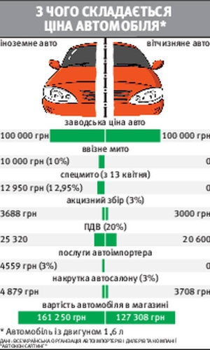 - Спецпошлиной правительство хочет защитить украинского автопроизводителя, - говорит Олег Омельницкий, 36 лет, директор компании "Автоконсалтинг". - Ведь после введения Россией в августе прошлого года утилизационного сбора продажа украинских машин в России существенно уменьшилась. Производство украинских автомобилей сократилось вдвое. В декабре останавливался КрАЗ. В феврале - ЛАЗ. Завод "Богдан", где производят "хюндаи" и "лады" - на грани банкротства. После введения спецпошлины разрыв в стоимости украинских машин и иномарок увеличится на 10-15 процентов. Сейчас, например, "ЗАЗ Вида" стоит 88 900 гривен. Французская машина такого же класса "Рено Логан" - 97 900 гривен. После введения пошлины "логан" подорожает приблизительно на 8-10 тысяч и украинский автомобилист, скорее всего, купит более дешевую "виду".