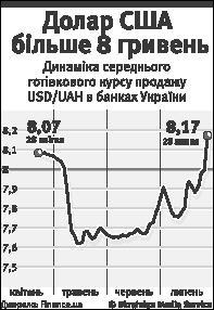28 июля банки купили на валютном аукционе $100 млн. по курсу 7,75 грн, но в обменниках в тот же день доллар "висел" уже по 8,1–8,2 грн.