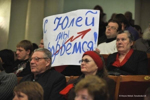 Не удивительно, что на эту встречу с Тимошенко пришли несколько тысяч человек. Они держали написанные от руки плакаты с поддержкой ее действий: "Мафия, руки прочь от Тимошенко", "С Юлей мы прорвемся!", "Доверяем Тимошенко".