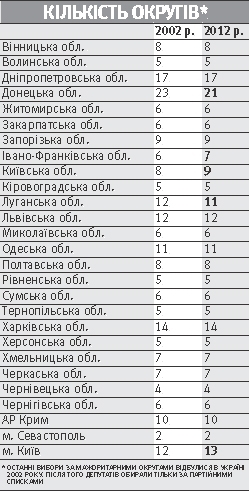 Центральная избирательная комиссия распределила 225 одномандатных избирательных округов по областям Украины. Из-за изменения количества населения Донбасс потерял два округа, Луганщина — один. В Ивано-Франковской, Киевской областях и городе Киев стало больше на один округ. Уменьшилось и среднее количество избирателей на округ: с 170,06 тыс. человек до 161,1 тыс.