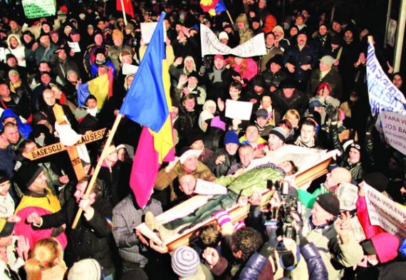 В субботу в центре Бухареста несколько тысяч протестующих требовали прекратить реформу и не сокращать государственные расходы. В воскресенье их поддержали революционеры 1989 года, которым сократили льготы. Количество митингующих достигло десятка тысяч. К ним присоединились футбольные фанаты и отдельные деятели оппозиции. Начались массовые столкновения с полицией. Демонстранты поджигали машины и били витрины, забрасывали камнями полицейских. Те применили водометы и слезоточивый газ.