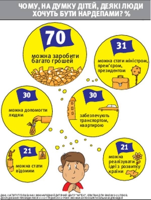 Нам навязывают мысль, что олигархи, министры, депутаты являются элитой. Для взрослых, может, и так. Многие считают их успешными. Но счастливы ли они? Наши политики хотя и обеспечены, но в счастье только играются. В действительности они вынуждены жить за заборами, выбираться за пределы городов в закрытые районы или даже выезжать с семейством за границу. Поэтому те, кто называет себя элитой, не могут быть свободными. Детям, очевидно, это понятно на своем уровне, и поэтому среди них избрать путь политика готовы только 20 процентов. Думаю, молодежь отражает настроения в обществе. Опросы показывают, что не больше 20 процентов населения поддерживают тех, кто при власти.