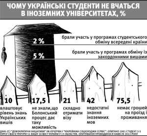 Большинство украинских студентов не участвуют в студенческих обменах с иностранными и отечественными вузами. Среди препятствий называют нехватку средств на жизнь в другой стране и незнание языков.