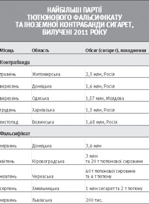 Только за этот год из украинских базаров, киосков и магазинов изъято 120 миллионов незаконных сигарет. Это почти на четверть больше, чем в прошлом году. Конфискованных сигарет было бы достаточно, чтобы застелить ими всю автотрассу от Киева до Одессы. Кстати, именно Киев и Одесская область считаются центрами торговли нелегальными сигаретами в Украине. Согласно результатам исследования Государственной инспекции по защите прав потребителей, 75% киевских и 56% одесских торговых точек, которые продают табачные изделия, реализуют также и контрабандные и поддельные сигареты. Показатели Киева и Одессы превысила лишь Ровенщина — здесь на всех проверенных торговых объектах найдена нелегальная табачная продукция.