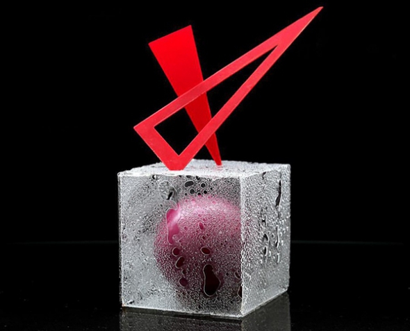 Пирожное "Шар. Куб. Треугольник" состоит из 3 частей. Круглое пирожное стоит внутри прозрачного квадрата с изомальт. Это разновидность сахара. Его рассыпают на противень между двумя силиконовая ковриками. В духовке он тает и становится похожим на лед. По вкусу как леденец петушок на палочке. Затем стенки клеят в квадрат. Треугольники делают из красного шоколада. Для этого белый красят красителем. Куб и треугольник - это декор. Вы его снимаете едите пирожное. Внутри - шоколадный бисквит, конфи из черной смородины и голубики, мусс с карамелизированным шоколадом.
