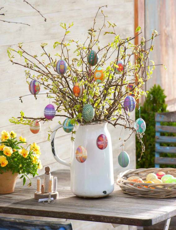 Шаг 7. Писанки, рисованные воском, будут хорошо смотреться на свежих ветках ивы. Такое мини-дерево можно делать, если из яиц было в начале выпущено жидкость.