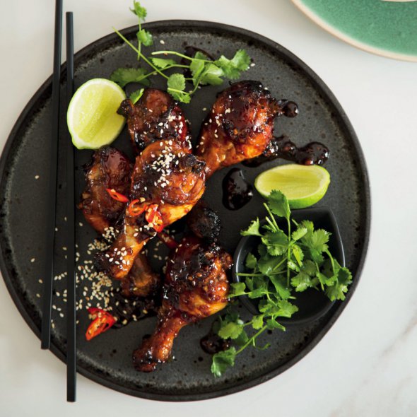 Также можно запечь куриные голени с медом и соевым соусом. Можно использовать и бедра, крылышки, или любые другие части курицы. Украсить можно кусочками лайма, перца чили и зеленью.