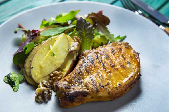 Стейк свинины с яблоками в горчичном соусе, отличный вариант для семейного ужина на праздник.