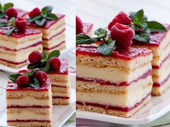 Малина любой десерт сделает изысканным. Она очень ароматная и яркая на вид. Мало просто торт украсить этими ягодами. Ванильные коржи чередуются с желейными и белоснежным сливочным кремом. Такому торту нужно постоять несколько часов в холодильнике, чтобы хорошо скрепиться. После того как все ингредиенты обменяются ароматами, они стают как единое целое.