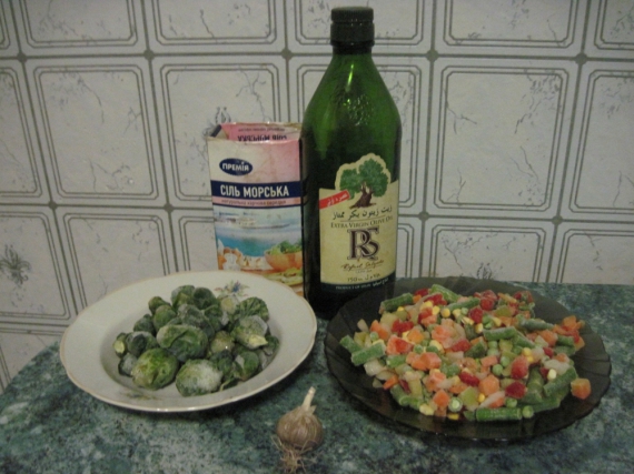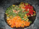 "Если добавить чайную ложку сахара, то капуста остается ярко-зеленой. Охлаждают ее под проточной водой из крана. У меня была смесь замороженных овощей - морковь, горошек, кукуруза, спаржевая фасоль, перец и лук. Взяла ее горсти четыре."