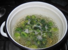 На стакан риса берет 200 грамм капусты. Срезает острым ножом остатки початков. Приваривает в кипятке 4 минуты.