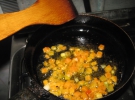 Пока варится капуста, выбирает из смеси морковь и перец. Разогрев в глубокой сковороде оливковое масло. Когда появляется запах, высыпает кубики моркови. Обжаривает 4 минуты до мягкости. Кладет в сковороду 4 забка чеснока в шелухе.