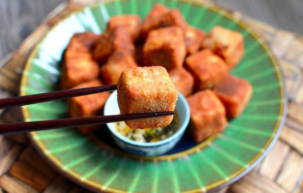 Тофу нарезать кубиками и смешать с пищевыми дрожжами, мукой, чесночным порошком, солью и перцем. Обжарить на разогретой сковороде до золотистой корочки. Готовое блюдо подавать горячим.