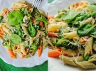 Чеснок - сильный вкусовой ингредиент. Если его измельчить и добавить к вермишели, она вступит сливочно-бежевого цвета. А если к чесноку прибавить еще и измельченную зелень - базилик, петрушку, розмарин, эстрагон - вы сможете удивить гостей ароматно-чесночными макаронами с зелеными вкраплениями.