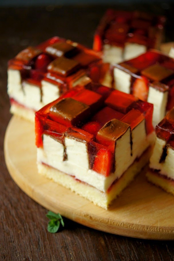 Охладить не до затвердения. Вылить клубничное желе на конфеты.