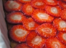 Бисквит смазать тонким слоем клубничного варенья и положить слой нарезанного клубники.