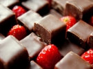 На слой, еще не застывшего крема выложить конфеты, сверху, в произвольном порядке несколько ягод клубники.