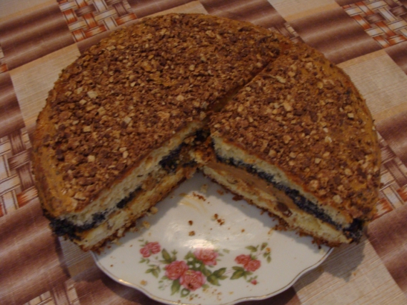 "1 стакан мака протерла в деревянной ступке. Добавила 2 желтка, 150 грамм сахара, 1 столовую ложку мягкого масла. Отдельно сбила 3 ??белка в крепкую пену. Все аккуратно смешала. Вторую часть теста также распределила по форме, залила маковой массой и пекла полчаса. Пока коржи охлаждающей из 400 г масла и полбанки вареной сгущенки миксером взбила крем ", - объясняет Галина.