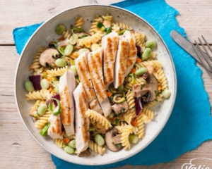 Выкладывайте сверху нарезанную жареную индейку и свежие бобы или зеленый горошек.