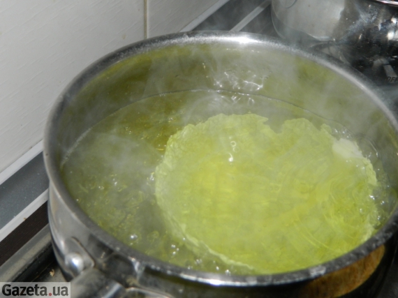 "Вместо обычной капусты беру савойскую. Не знаю, как вам, а мне она вкуснее, ароматнее и очень мягкая. Кроме того, ее легко разбирать на листья - просто обрываю, без запаривания, а затем каждый лист, если маленькие, то по два листка, погружаю в подсоленную воду на 30 секунд. Вода не должна кипеть сильно, только чуть побулькивать на маленьком огне", - подробно рассказывает хозяйка.