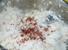 "Дело в том, что курятина не такая сочная, как другое мясо, поэтому надо побольше тушеных овощей. Так, запаренный рис, тушеные лук и морковь, курица и обязательно сушеный красный перец - все хорошо перемешиваю, добавляю соль по вкусу. Свежий перец не даю никогда, только сушеный, ведь свежий добавляет характерный аромат, а сушеный - просто делает начинку вкуснее", - убеждает она.
