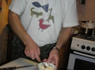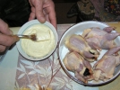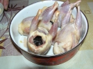 Тушки продаются выпотрошенные. В каждую Александр вкладывает по 3 чорносливины, предварительно облив их кипятком. Слегка солит. Для соуса смешивает майонез и горчицу в соотношении 3 к 1. Натирает тушки смесью, затем посыпает перцем и еще раз солит.