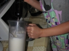 К вымешенному добавляет небольшими частями белки, и хорошо вымешивает ложкой.