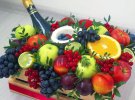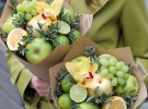 Собрать фруктово-овощную композицию с цветами можно за считанные минуты еще и собственными руками. Фрукты насаживают на деревянные шпажки. Массивные располагают посередине, меньшие - по кругу. Чтобы букет крепко держал форму, тщательно обматывают каждый элемент скотчем внизу шпажки.