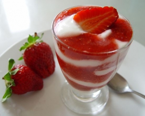 "Такой десерт лучше подавать в высоких стеклянных бокалах. Ягоды мою и отрываю хвостики. Большие режу на четыре части, меньшие разрезаю пополам. Выкладываю их на дно. Толщина первого слоя должна быть около 2 сантиметров.