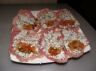 "Для начинки беру 2 столовые ложки творога, - продолжает она, - добавляю два измельченных зубчика чеснока, мелко нарезанный укроп. Хорошо вымешиваю и выкладываю на отбитые куски свинины ".