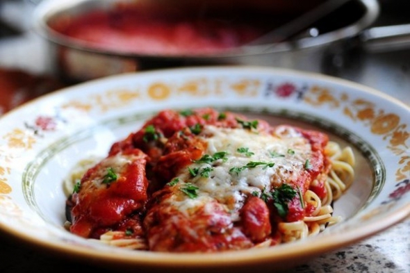 Варит полкилограмма длинных спагетти. Отбивает молотком 6 кусков куриного филе. Высыпает в мелкую тарелку полстакана муки, соль, перец по вкусу.