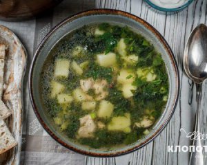 Подавайте зеленый борщ с горячим. Сверху кладите ложку густой сметаны.