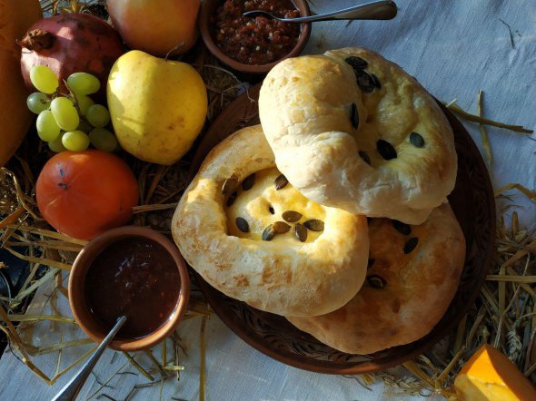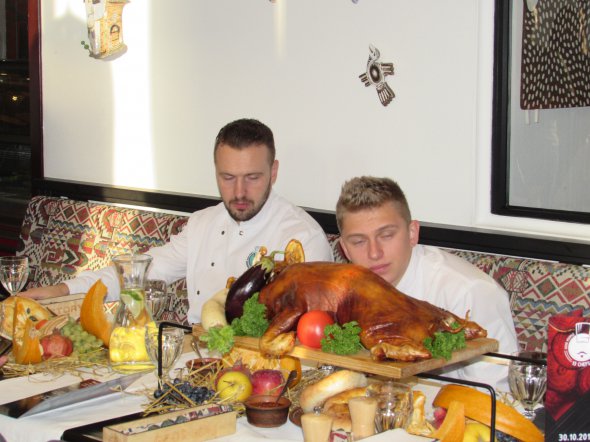 Столы украшены разрезанными кусками тыквы, гранатами, виноградом и хурмой. Все это растет в свободном доступе на родине шеф - повара. Но главным украшением стола является молочный поросенок в золотисто - медовой корочке.