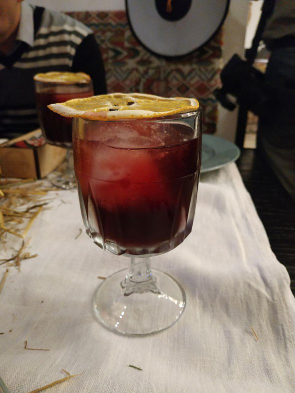 Дополняет блюдо коктейль "Сакварелло", который прикрывает сушеный апельсиновый цукат. Он на вкус напоминает глинтвейн, но холодный.