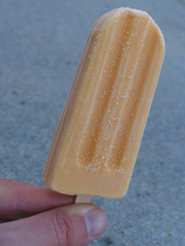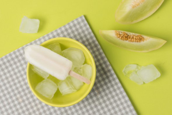 Взять формочки для фруктового льда, налить в них дынно-сливочную смесь, оставив немного свободного места, и вставить палочки.