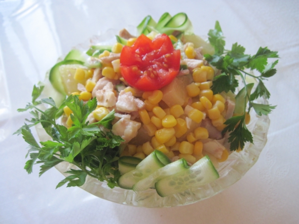 "Пошла в магазин, докупила кукурузы и ананасов - и вперед. Раз пришла в магазин, а там разобрали все куриные филе, так покупала окорочка. Домашние куры для этого салата не подходят. Мясо должно быть нежное, а те - жесткие. Можно вместо курицы взять индейку или кролика".