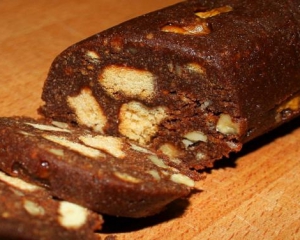 Когда колбаски затвердели, нарезала их на порционные куски. Вместо сахара можно положить сгущенное молоко, а вместе с печеньем - грецкие орехи.