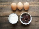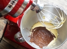 Перелить желтки в чашу миксера и хорошо взбейте 3 минуты. Налить шоколад, перемешаты и вылить сливки.