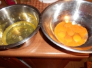Пока пекутся коржи, Мирослава готовит крем. Нужно 9 желтков, полтора стакана сахара, 2 столовые ложки какао, ложка сметаны, 1 пачка маргарина или масла, желательно польского производства. Взбивает желтки с сахаром, добавляет какао и сметану. На плитку ставит широкую кастрюлю с водой. Когда вода закипает, ставит на водяную баню железную миску с кремом. Варит 10-15 минут. Чтобы быстрее остыло - держит в холодной воде. Добавляет маргарин и взбивает смесь миксером.