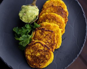 Срезать зерна с очищенной кукурузы. Должно получиться примерно 400 г. Добавить яйцо, муку, соль и перемешать. Полученную смесь выложить на разогретую сковороду и обжарить с обеих сторон до румяной корочки. Масса получается нежной, поэтому оладьи следует переворачивать осторожно. Готовое блюдо подать с острым гуакамоле.