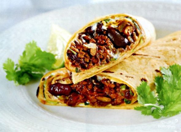 Мелко нарезать и обжарить лук с фаршем до готовности. Слить жидкость из кукурузы и фасоли. Болгарский перец очистить от семян и нарезать кубиками. Соединить фарш с овощами, добавить специи и 100 граммов сыра. Залить все томатным соусом. Тушить несколько минут на среднем огне. Тортильи или порции лаваша посыпать сыром и выложить сверху начинку, свернуть конвертиками и подсушить на сухой раскаленной сковороде в течение нескольких минут.
