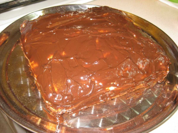 "Коржи перемазываю кремом. Сверху торт покрываю шоколадной глазурью, которую готовлю из обычной шоколадки. Плитку ставлю в микроволновку на 10-15 секунд.