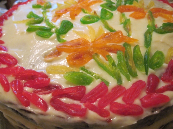 Обязательно обмазывает кремом торт сбоку и сверху, размазывает пластиковой лопаточкой. Затем украшает сверху цукатами. Пальмы из цукатов сделала за 15 минут.